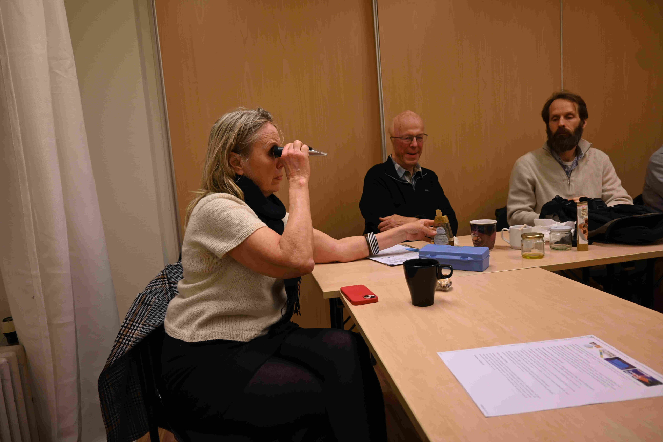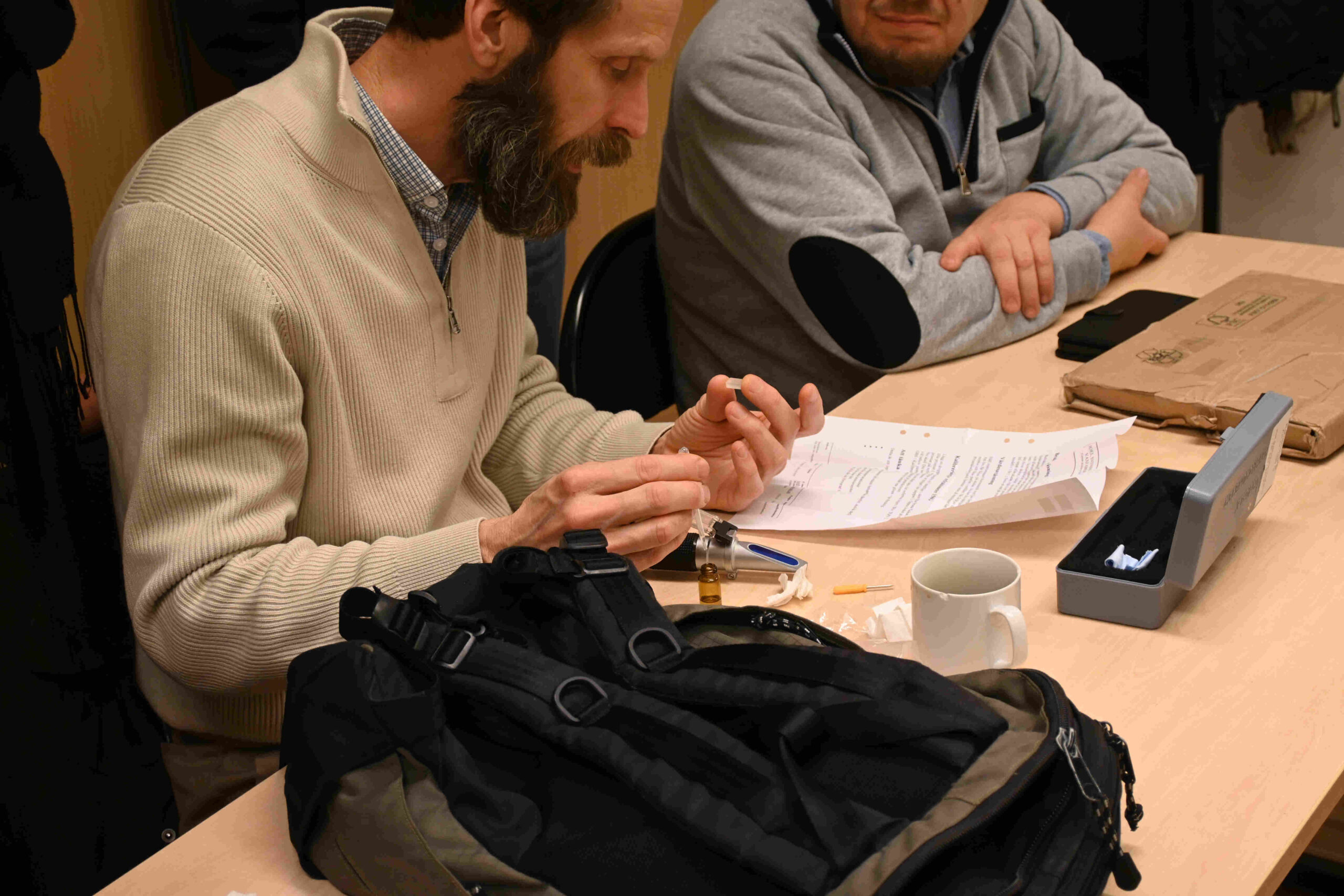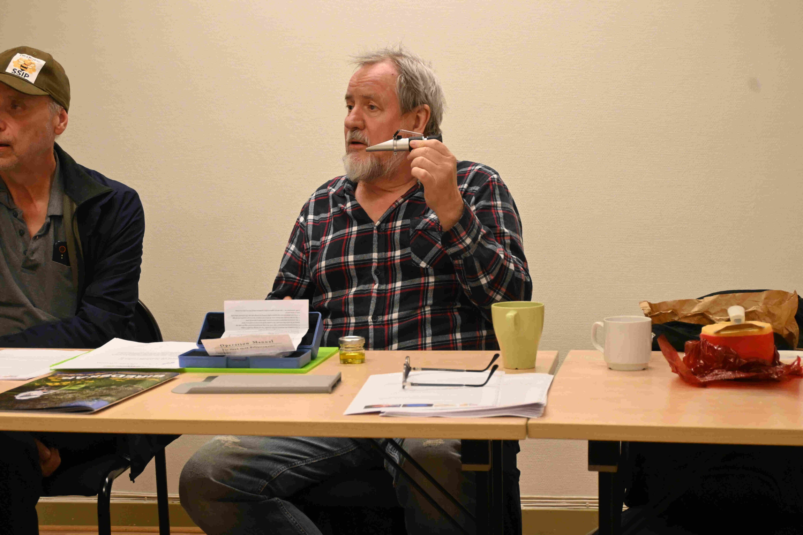 Våra verktyg och material är en central fråga i biodlingen. Under mötet diskuterade vi brett angående biredskap. Vi presenterade favoritverktyg och kalibrerade våra refraktometrar. Klas gav oss teorin bakom detta optiska instrument. Med hjälp av manualen från Tjörn/Orust fick refraktometerna precision.